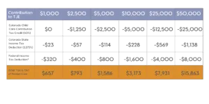 The credit means that half of your donation—as long as it is designated for a 5C program—is offset by a reduction of your Colorado income taxes. You will still be able to claim your full contribution as a charitable deduction on your Federal and State income tax returns if you itemize deductions, meaning your donation is even more beneficial.
