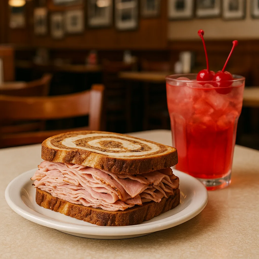 Papa Barry’s Working Lunch Deli Style Turkey Pastrami on Marble Rye with a Shirley Temple