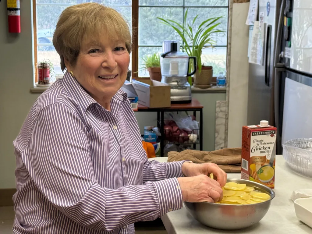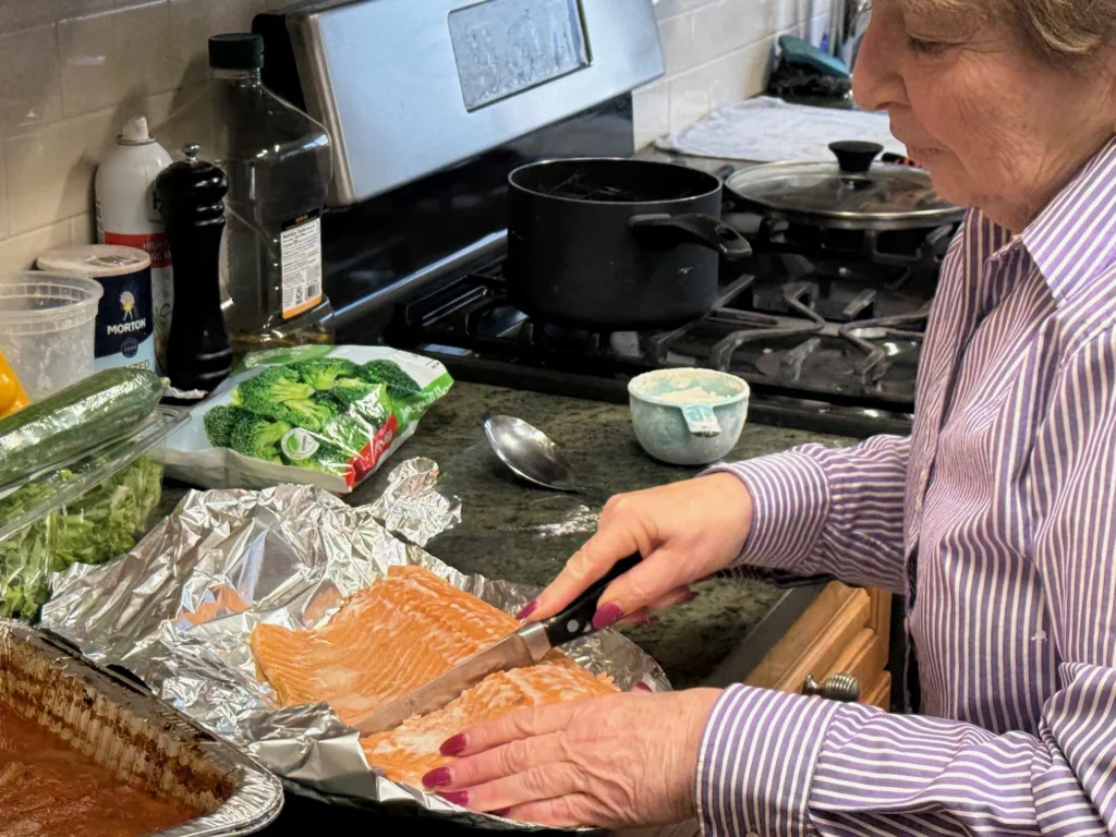 Chef Leban in the kitchen, bringing a Wine & Cheese Gala prize to life as she prepares a full, home-cooked Shabbat dinner for Kim and Jonathan Fishman, turning a night at the gala into a meaningful Shabbat at home.